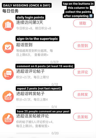 Complete all tasks possible (all marked with lightning bolt emoji), some will require you to send posts in weibo